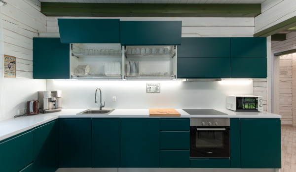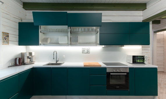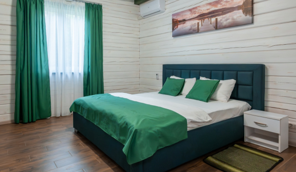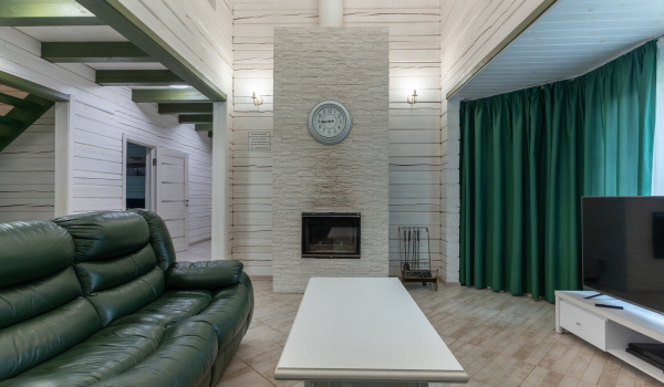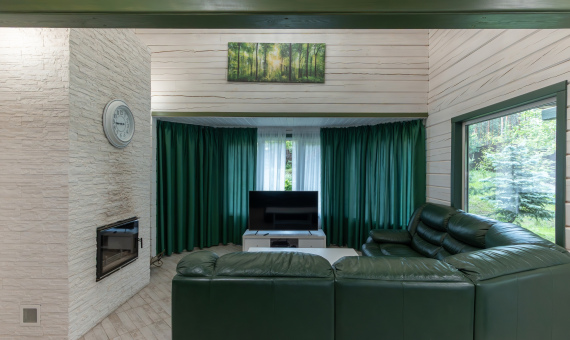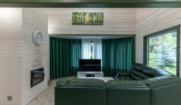 Двоповерховий просторий будинок з великими вікнами, високими стелями та дерев'яним інтер’єром. У помешканні — три спальні, кухня-студія, камінна зона, два санвузли.