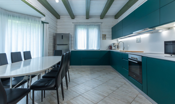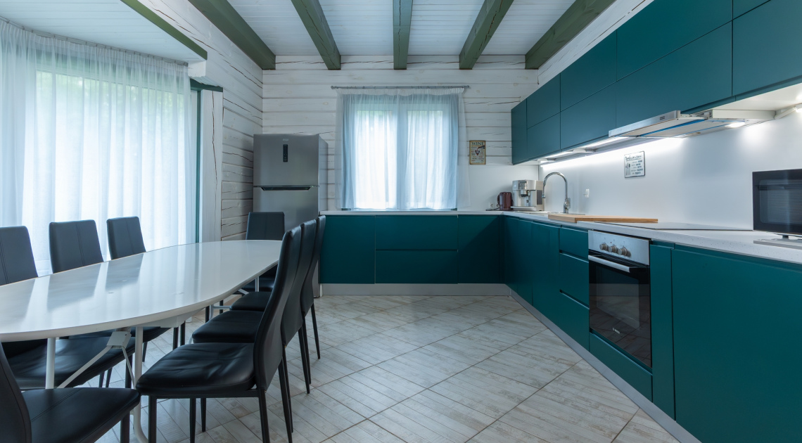 Усі кімнати наповнені світлом завдяки панорамним вікнам. Кухня та їдальня — об’єднаний простір для приготування та зустрічей. У будинку — зйомка проходила з професійним освітленням, що підкреслює естетику деталей.