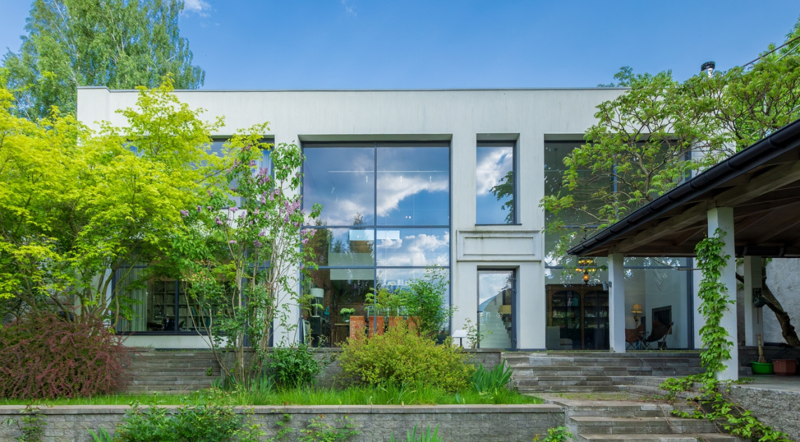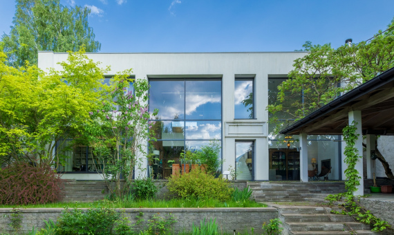 Цей будинок створений архітектором — і це відчувається в кожній деталі. Сучасний фасад з великими панорамними вікнами відкриває простір, світло і природу навколо. Висота стелі — 7 метрів, подвійне світло і чітка геометрія форм створюють відчуття легкості та масштабу.