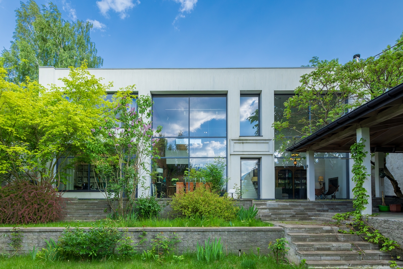 Цей будинок створений архітектором — і це відчувається в кожній деталі. Сучасний фасад з великими панорамними вікнами відкриває простір, світло і природу навколо. Висота стелі — 7 метрів, подвійне світло і чітка геометрія форм створюють відчуття легкості та масштабу.