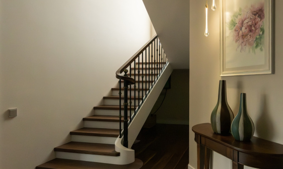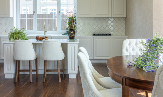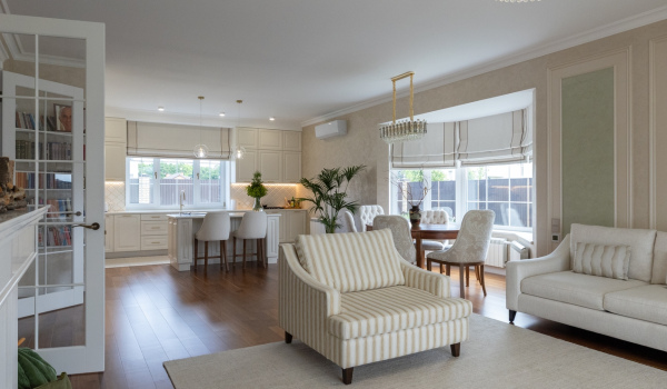 Інтер’єр будинку — вишуканий приклад сучасної класики. Світлі відтінки, м’які фактури, натуральне дерево і велика кількість денного світла створюють відчуття спокою та тепла. Кухня-студія, їдальня в еркері, простора вітальня, багато місця для зберігання — усе продумано до дрібниць. Дизайн продовжує архітектуру: стримано, стильно, вічно.